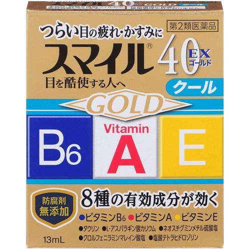 Smile 40 EX Gold Cool 是獅王(Lion)出品的第2類醫藥品眼藥水,13 ml裝。本款為獅美露系列中「EX Gold Cool」款,搭配8種有效成分,專為因長時間用眼、眼睛疲勞、視線模糊不適者設計,提供中等涼感釋放。全程無防腐劑(例如苯扎氯銨),更貼近眼部需求。