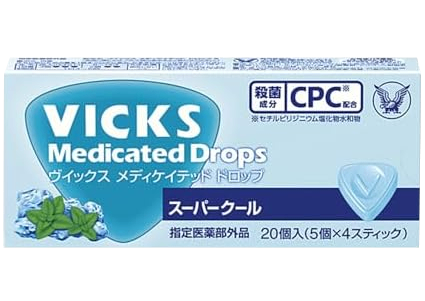 大正製藥推出的 VICKS 潤喉糖「超清涼薄荷味」,為指定醫藥部外品。內含 CPC(西吡氯銨)殺菌成分與薄荷清涼配方,可舒緩喉嚨腫痛、聲音沙啞、喉乾,並同時為口腔殺菌除臭,適合日常保健或上班使用。