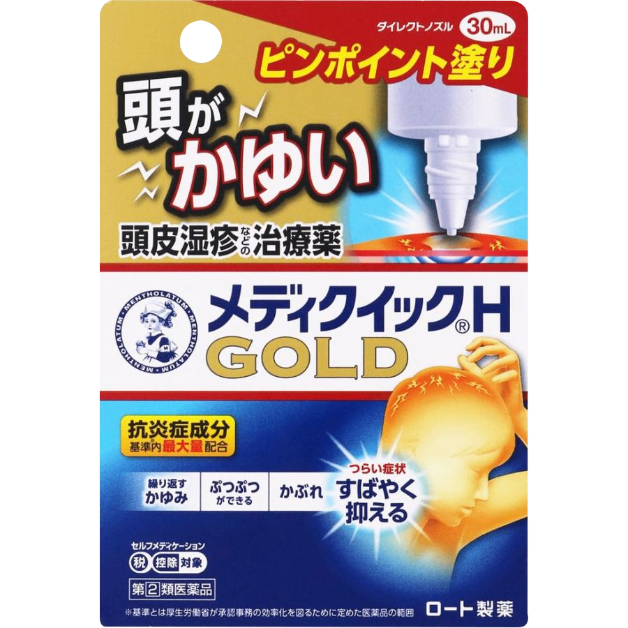 Medi Quick H Gold 是曼秀雷敦研發的頭皮用濕疹治療藥,屬於日本第2類醫藥品。專為緩解頭皮濕疹引起的瘙癢、紅疹、丘疹與刺痛設計,以高濃度抗炎成分直達患處,用後涼感不黏膩,適合配戴帽子或頭套者使用。