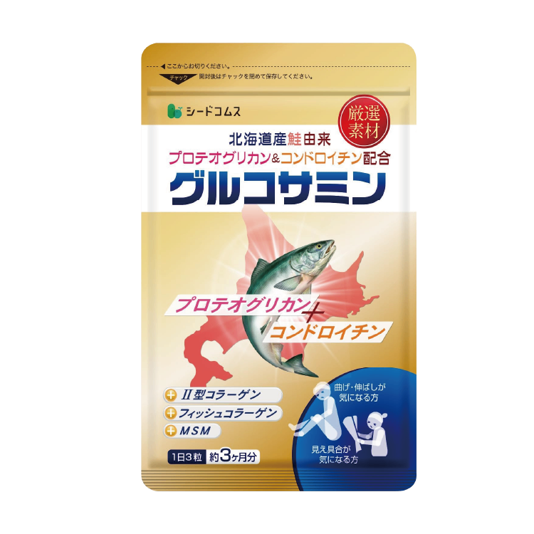 鹽酸葡萄糖胺(日本國內製造)、結晶纖維素、硬脂酸鈣、二氧化矽/膠原蛋白胜肽、MSM(甲基硫醯基甲烷)、糊精、鮭魚頭軟骨萃取物(含軟骨素)、雞軟骨萃取物、含蛋白聚醣之鮭魚鼻軟骨萃取物(本產品部分原料含有蝦、蟹、明膠、鮭魚、雞肉)